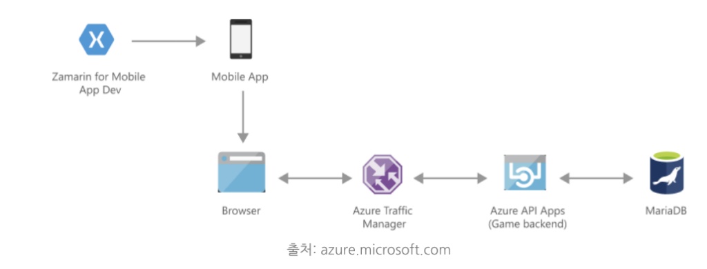 모바일 앱 운영에도 Azure Database for MariaDB가 잘 어울리는데요, 크로스 플랫폼 지원을 기본으로 모바일 앱 운영을 하는 경우 다음과 같은 구성을 고려해 볼 수 있습니다.