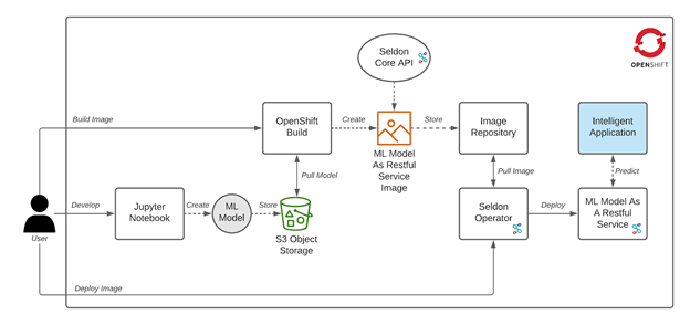 소프트웨어 프로비져닝의 경우 자체 컨테이너 카탈로그나 NVIDIA가 제공하는 NGC 서비스를 이용하면 됩니다. 하드웨어, 소프트웨어 준비를 마친 다음 실제 배포는 오픈 소스 프레임워크인 Seldon Core를 이용하면 됩니다. 이를 이용해 모델 훈련 및 서빙 워크플로우를 간단히 구현한 예를 한번 보겠습니다. 과학자나 개발자는 OpenShift 환경에 배포한 Jupyter 노트북 인스턴스를 이용해 모델을 개발하고, S3 오브젝트 스토리지 버킷에 모델을 배포합니다. 이후 OpenShfit Build로 애플리케이션 이미지를 생성하고, Seldon Core API로 이를 래핑하고, Seldon Operator로 해당 모델을 ML as a Restful Service로 배포합니다.
