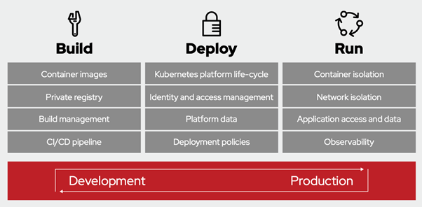 다음으로 배포 과정에서는 앞서 언급한 File Compliance Operator와 Integrity Operator를 통해 플랫폼 측면의 보안 요구 사항을 충족할 수 있습니다. 접근 제어는 OpenShift의 RBAC 기능으로 클러스터 환경 전반에 걸친 관리를 간소화할 수 있습니다. 데이터 보호는 TLS, X.509, 토큰 기반 인증 등 암호화 기술을 활용해 전송 중인 데이터와 저장된 데이터 모두를 보호합니다. 참고로 저장된 데이터의 경우 레드햇 OpenShfit Container Storage를 적용할 경우 하이브리드 멀티 클라우드 환경에서 이용하는 일반 스토리지(Persistent Volume), 공유 스토리지(NFS, Ceph, Cluster), 블록 스토리지(EBC, GCE, iSCSI)를 대상으로 일관성 있게 암호화, 복제 등의 데이터 서비스를 적용할 수 있습니다. 한편, 정책 배포는 Red Hat Advanced Cluster Management for Kubernetes를 통해 간편히 할 수 있습니다.