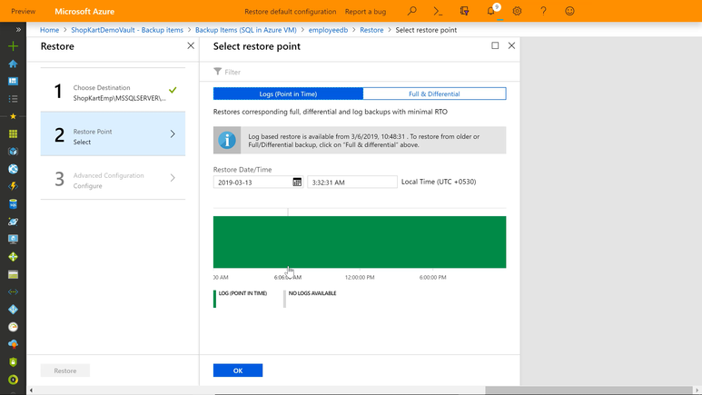 그렇다면 손에 익은 백업 솔루션과 비교해 Azure Backup for SQL Server가 얼마나 쓸만한지 알아보겠습니다. 가장 먼저 봐야 할 복구 목표 시점(RPO: Recovery Point Objective)은 15분입니다. 이 말은 15분 전 데이터까지 최근 시점의 복원이 가능하다는 것이죠. 15분 단위로 백업을 받아 두니 얼마나 든든합니까.