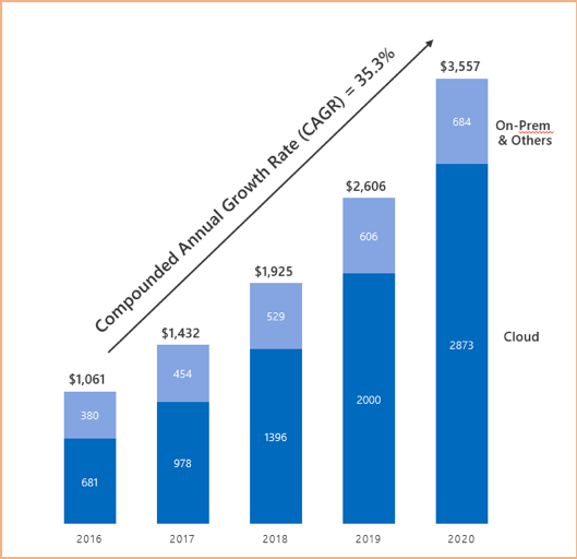 IDC와 Microsoft가 공동 작성한 분석 보고서는 오픈소스 DB 성장률을 연평균 35.3% 수준으로 파악했군요. IT시장의 성숙도와 DB 도입 현황을 고려할 때 놀라운 결과이죠. 그리고 보고서에서 확인할 수 있는 또 다른 놀라운 사실은 오픈소스 DB 운영 플랫폼으로 “클라우드”를 선택하는 비율이 76% (2019년 기준, 2020년에는 81%)를 넘는다는 점입니다.