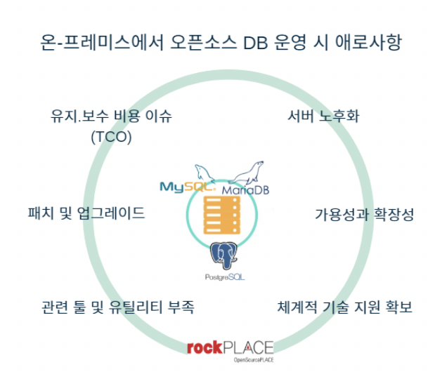 라이선스가 없거나 아주 작은 오픈소스 DB의 도입 비용은 매력적이죠. 이런 이유로 오픈소스 DB의 유지.보수 비용도 낮다고 믿는 경우가 많습니다. 하지만, 앞에서 언급된 가용성과 전문 인력의 확보 비용, 빈번한 패치와 업데이트 작업 그리고 전문 기술 지원 등을 고려하면 오픈소스 DB의 유지. 보수 비용(TCO)이 상업용 제품을 넘어서는 경우도 생기곤 합니다. 오픈소스 DB가 계속적으로 고객의 선택을 받기 위해 넘어야 하는 과제 중 하나라고 생각됩니다. 저희 락플레이스의 경험을 토대로 온-프레미스 환경에서 오픈소스 DB를 이용하는 기업의 애로 사항들을 몇 가지 정리해 보았습니다. 오픈소스 SW의 아름다운 공유 철학과 비전 그리고 경제적 합리성 때문에 오픈소스 DB를 선택하는 기업이 많은 것은 잘 알려진 사실입니다. 그렇다면, 이 선택이 계속 유효하도록 만들기 위한 전략과 대책이 필요하죠 않을까요? 다음 포스트에서는 오픈소스 DB를 더욱 안정적으로 그리고 경제적으로 활용할 수 있는 방안에 대한 락플레이스의 생각을 공유해 드리겠습니다.