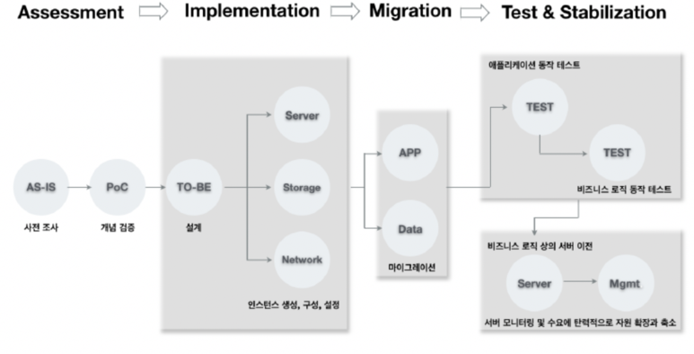 * 클라우드 운영 및 마이그레이션 경험이 풍부한 전문 엔지니어를 배정하여 진행합니다. 그림) 클라우드 마이그레이션 단계