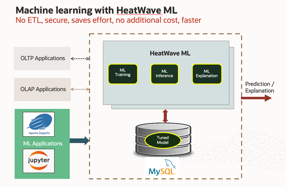 HeatWave ML이란 기능을 이용하면 되는데요, 이 기능을 이용하면 ETL 작업 없이 데이터베이스 내에서 데이터를 준비하고 머신 러닝 모델 훈련과 추론 작업을 할 수 있습니다. 데이터 과학자나 개발자는 ML_TRAIN 구문을 이용해 간편하게 훈련을 수행하거나, 생성한 머신 러닝 모델을 사용한 예측도 ML_PREDICT_TABLE을 통해 간편히 할 수 있습니다. 더 자세한 내용은 HeatWave ML 문서를 참조 바랍니다.