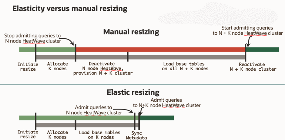 MySQL HeatWave는 클라우드와 유사한 방식의 확장성을 통해 매우 놀라운 탄력성을 제공합니다. 클라우드 환경에서 오토스케일링을 이용하는 것과 비슷한 경험을 제공한다고 볼 수 있습니다. 보통 확장 작업은 수작업으로 이루어집니다. 워크로드 요구에 맞게 클러스터 확장과 축소가 필요할 경우 작업 요청을 해야 하죠. 확장하는 과정에서는 쿼리를 수행할 수도 없고요. 그러던 것이 최신 버전부터 사전 설정을 통해 노드 수를 자동으로 조정할 수 있는 기능이 지원됩니다. 따라서 사람의 개입 없이 워크로드에 맞게 클러스터를 늘렸다 줄였다 할 수 있습니다.