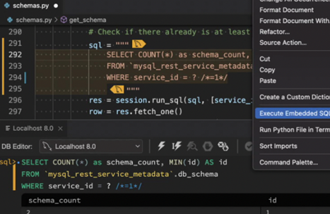 세 번째는 워크플로우 통합입니다. 새로운 익스텐션 덕분에 이제 개발자나 DBA는 여러 창을 띄워 놓고 작업하지 않아도 됩니다. 소스 파일에 포함된 SQL을 가져와 데이터베이스 편집기에서 실행하거나, 파이썬 파일에서 여러 줄의 SQL 블록을 실행하거나, 변경 사항을 원본 파이썬 파일에 업데이트하는 등의 작업을 VS Code 환경에서 편하게 할 수 있습니다.