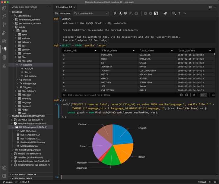 두 번째는 노트북 인터페이스입니다. MySQL 워크벤치 인터페이스에 다들 익숙하실 텐데요, 비교하자면 VS Code용 MySQL 쉘 프리뷰가 제공하는 인터페이스가 더 직관적인 것 같습니다. 이 인터페이스를 이용하면 대화식으로 작업을 편히 할 수 있습니다. 노트북 스타일의 인터페이스에서 SQL, TypeScript, JavaScript로 쿼리 수행, 데이터 시각화 등의 작업을 할 수 있습니다. SQL, TypeScript, JavaScript 자동 완성 기능도 빼놓지 않게 지원하네요. 또한, MySQL 쉘 GPU 콘솔을 이용하면 SQL 쿼리를 쉽게 편집할 수 있습니다.