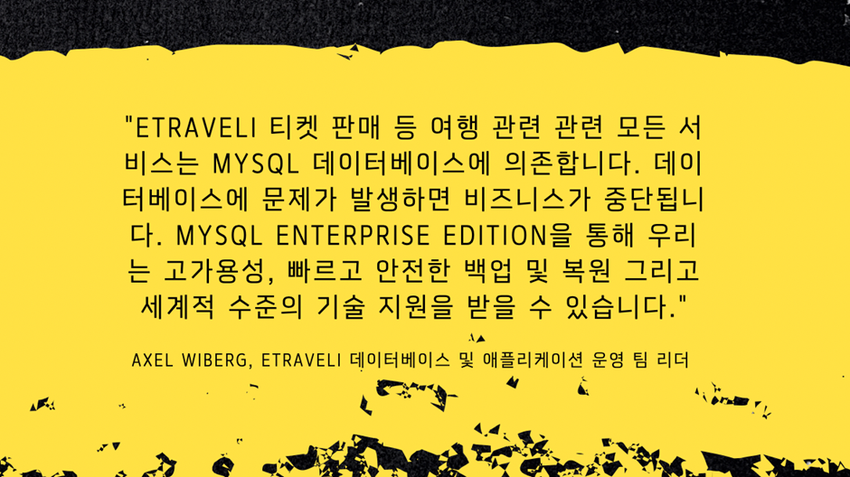 유럽에서 가장 큰 온라인 여행사인 Etraveli는 커뮤니티 버전의 MySQL을 사용하다 2014년에 MySQL Enterprise Edition으로 전환하였습니다. 이런 결정을 내린 이유는 무엇일까요? 코로나19 전 전 세계 온라인 여행 시장은 급성장하였습니다. 사용자가 늘면 업종을 가리지 않고 똑같은 고민을 합니다. 중요 시스템 다운타임으로 인한 서비스 중단 걱정이죠. 경쟁이 치열한 온라인 여행 업계에서 장애나 점검으로 인한 서비스 중단이 잦다면? 아무래도 사용자 경험 측면에서 좋을 것 없습니다. Etraveli는 가장 중요한 시스템인 데이터베이스의 가용성 보장과 백업과 복원 효율을 높이기 위해 MySQL Enterprise Edition을 택하였습니다.
