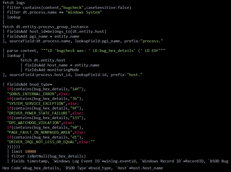 Dynatrace는 DQL이라는 쿼리 언어를 통해 사용자가 필요한 정보를 빠르게 조회할 수 있도록 돕습니다. BSOD 문제가 언제 발생했는지 확인하기 위해 DQL을 사용하여 윈도우 시스템 로그를 검색할 수 있습니다. 다음은 쿼리의 예입니다.
