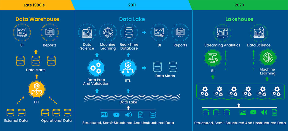 거래 기록, 판매 데이터, 고객 정보와 같은 정형 데이터를 저장하고 BI 분석과 보고서를 생성하는 방식이 일반적이었습니다.