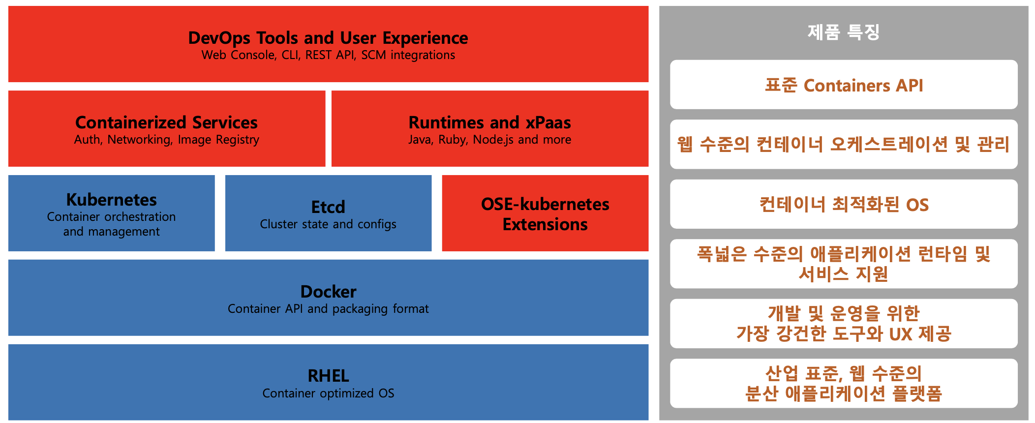기술 내재화 과정에서 겪게 되는 시행착오를 최소화하는 가운데 쿠버네티스 설치, 배포, 강화, 운영 모든 단계를 일관성 있게 밟아 나갈 방법은 없을까요? 이런 시장의 요구에 대한 레드햇의 응답이 바로 Red Hat OpenShift입니다. Red Hat OpenShift는 도커 표준을 기반으로 한 엔터프라이즈 쿠버네티스 플랫폼으로 보안 측면에서 기업의 요구 수준을 충족하는 신뢰 기반을 제공하는 가운데 자동화 기반의 운영으로 기업이 개발에만 집중할 수 있는 길을 제시합니다.