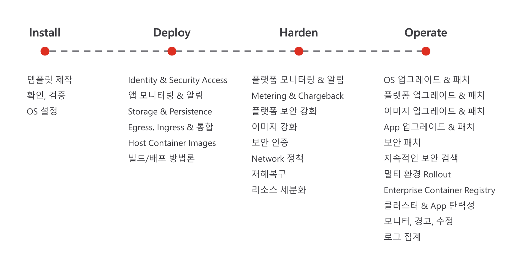 쿠버네티스와 같이 빠르게 진화 발전하는 기술은 열심히 공부한다고 해서 모두가 전문가가 되기 어렵습니다. 교육을 열심히 받아도 실제 구축과 운영 경험이 쌓이지 않으면 혁신의 템포를 쫓아가는데 급급하게 됩니다. 이는 실제 현장의 목소리에 잘 담겨 있습니다. 더뉴스택(The New Stack)의 설문 조사 결과에 따르면 엔터프라이즈 사용자의 75%가 구현과 운영의 복잡성으로 쿠버네티스를 도입하지 않고 있다고 답했습니다. 쿠버네티스를 잘 아는 이들은 많지만 이를 제대로 구현하는 것은 여전히 어려운 일입니다. 일반적으로 쿠버네티스 구축과 운영 관련해 고려해야 할 요소들은 다음과 같습니다. 많은 엔지니어가 설치와 배포 과정은 잘 압니다. 이는 각종 교육과 자료를 통해 학습할 수 있습니다. 하지만 경험의 영역에 속하는 강화와 운영 단계는 시행착오를 피할 수 없습니다. 이 단계에서 많은 조직이 부담을 느낍니다.