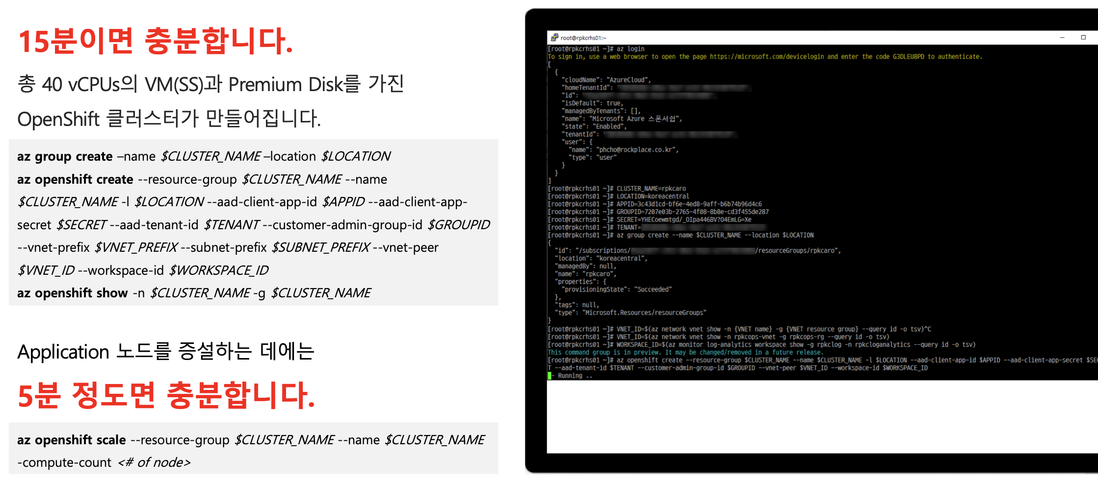 ARO는 사내에 인프라 전문가가 없어도, 쿠버네티스 구축 경험이 없어도 상관없이 누구나 이용할 수 있는 서비스입니다. 애저 사용 경험이 있다면 간편하게 배포할 수 있습니다. 가령 총 40개의 vCPU를 할당한 가상 머신들과 프리미엄 디스크로 구성된 Red Hat OpenShift를 구성하는 데 드는 시간은 15분이면 충분합니다. 애저 포탈의 웹 UI 또는 Azure CLI 명령으로 바로 구성할 수 있습니다. 애플리케이션 노드 증설도 5분이면 충분합니다.