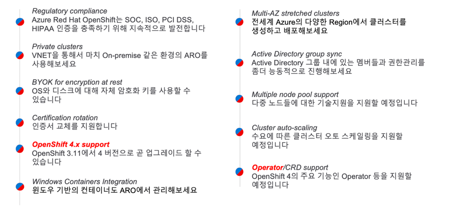 Azure Red Hat OpenShift을 통해 더 편리한 완전 관리형 서비스를 제공하려는 양사의 협력은 OpenShift 로드맵 반영에 고스란히 나타납니다. 레드햇이 4.x 버전 대를 통해 제공하는 강화된 마이크로서비스 아키텍처 지원 기능, 더 편리한 운영 기능 등은 매우 빠른 속도로 Azure Red Hat OpenShift에 적용됩니다. 이처럼 신속하게 최신 버전의 기능을 반영하다 보니 OpenShift를 사용 중이거나, 평가 중인 기업에서 프로덕션 환경에 최신 버전의 기능을 적용하기에 앞서 사전 평가 목적으로 Azure Red Hat OpenShift를 이용하는 곳도 늘고 있습니다.