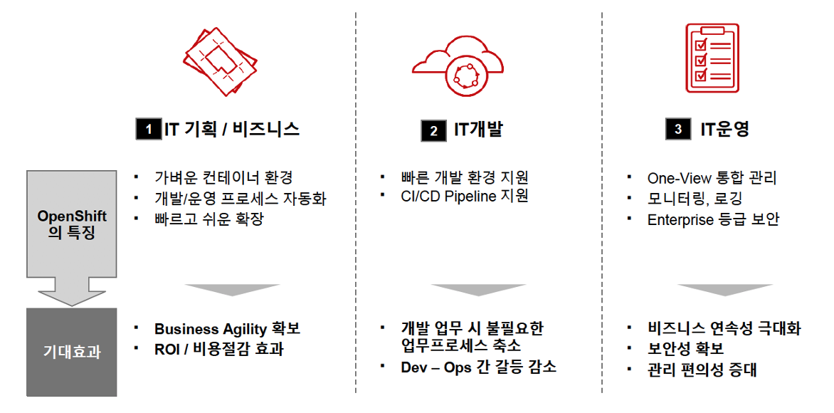 OpenShift는 컨테이너라이제이션 중심의 하이브리드, 멀티 클라우드 전환을 돕습니다. 이를 통해 기업은 DevOps 기반의 민첩성을 확보하고, IT 운영 효율을 높이고 비용을 줄이는 효과를 거둘 수 있습니다. 이는 국내외 주요 사례를 통해 입증되고 있는 OpenShift의 가치입니다.