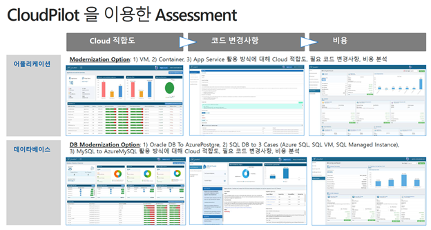 전체 절차 중 사전 준비와 이전 과정을 간략히 살펴보겠습니다. Oracle을 Azure Database for PostgreSQL로 이전하기에 앞서 CloudPilot을 이용해 평가를 수행합니다. CloudPilot은 애플리케이션 현대화를 위해 많이들 사용하는 도구입니다.
