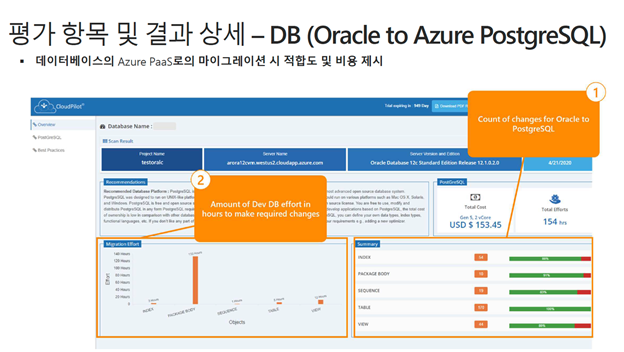 CloudPilot을 사용하면 Oralce뿐만 아니라, 이 위에서 운영하는 애플리케이션까지 투명하게 사전 평가를 할 수 있습니다. 애플리케이션 측면에서 VM/Container/PaaS 중 어떤 클라우드 환경으로 옮기는 것이 적합한지, 코드나 데이터베이스 변경이 필요한지, 비용 효율은 어느 정도인 등을 일목요연하게 파악할 수 있습니다. 다음은 Oracle 데이터베이스를 Azure Database for PostgreSQL로 전환하는 것에 대한 적합도 평가 및 소요 비용을 보여주는 화면입니다. 이 외에도 CloudPilot은 마이그레이션 상세 가이드, TCO 분석까지 친절히 안내합니다.