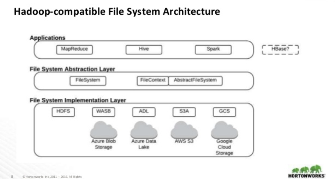 다음 그림은 하둡 클라우드 스토리지 진화 방향에 대한 호튼웍스의 전망인데요, 결국 추상화 계층을 통한 작업이 아니라 오브젝트 스토리지와 직접 하둡 애플리케이션 연결되는 그런 구조로 발전하는 것이 빅 데이터 커뮤니티가 원하는 것이라 할 수 있습니다. 이 바람에 가장 가깝게 구현된 기술이 ADL Gen2가 아닐까 합니다.