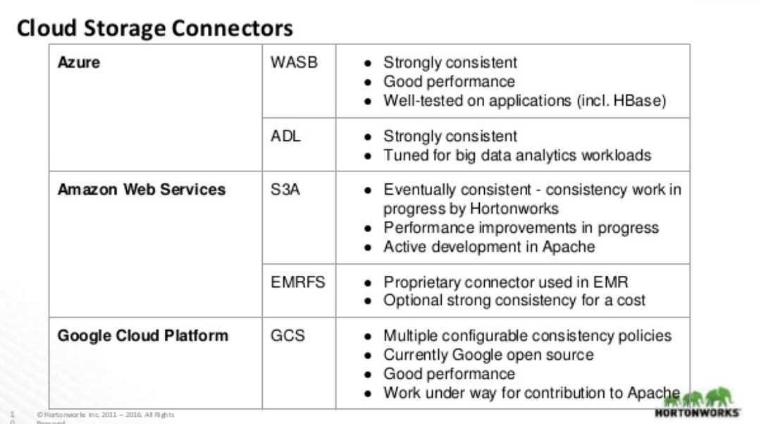다음 자료는 호튼웍스에서 작성한 것인데요. 클라우드 스토리지 관련 선택지를 보여 줍니다. 성능과 최적화 면에서 ADL은 최고죠.